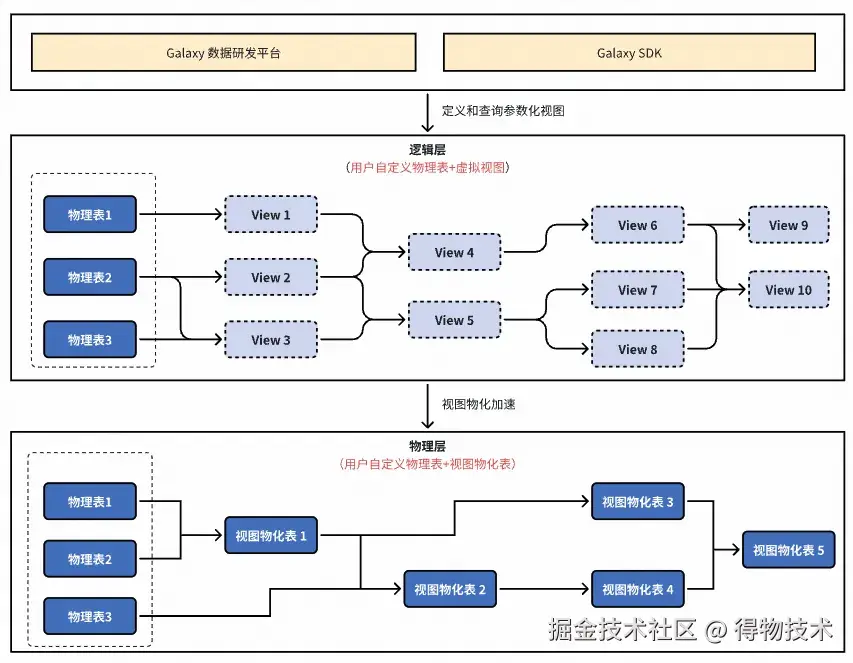 数据逻辑化架构,会存在两层,上层为由用户定义的物理表以及虚拟视图 组成的逻辑层 ,对用户感知;下层为物理表和系统自动生成的视图物化表 组成的物理层,对用户不感知,具体如下图所示: