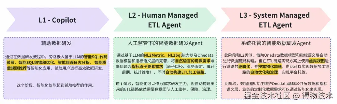 我们计划分3个阶段(L1~L3)建设Galaxy数据研发平台的智能化能力,来提升数据研发效率,降低业务自主进行数据研发的门槛,实现公司内部不同部门和岗位间的"数据平权" 。如下所示:
