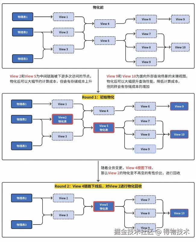 通过视图或参数化视图 进行整条数据链路的构建,那么整条链路就完全不需要任何存储成本,计算成本也仅在视图查询时才发生。但这样会导致一个问题,当视图逻辑复杂,嵌套层级多时,查询效率非常低,且对相同视图的查询都需要重新计算。因此我们需要对一些关键的视图进行物化,物化后的视图,在查询时可以直接访问其物化表,实现查询性能的大幅提升。