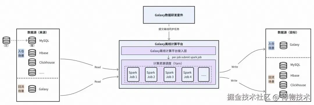 目前Galaxy数据研发套件的离线同步内核基于Spark Jar进行实现,下图为离线数据同步架构: