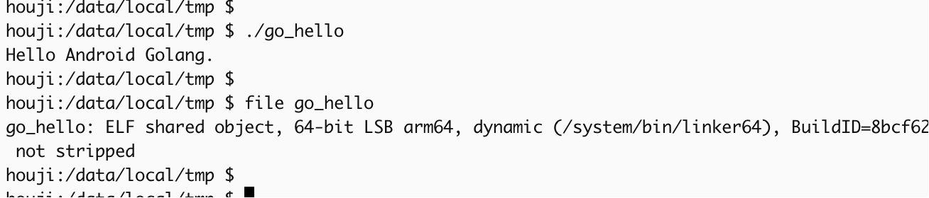 CGO_ENABLED=0 GOOS=android GOARCH=arm64 go build -o go_hello hello.go