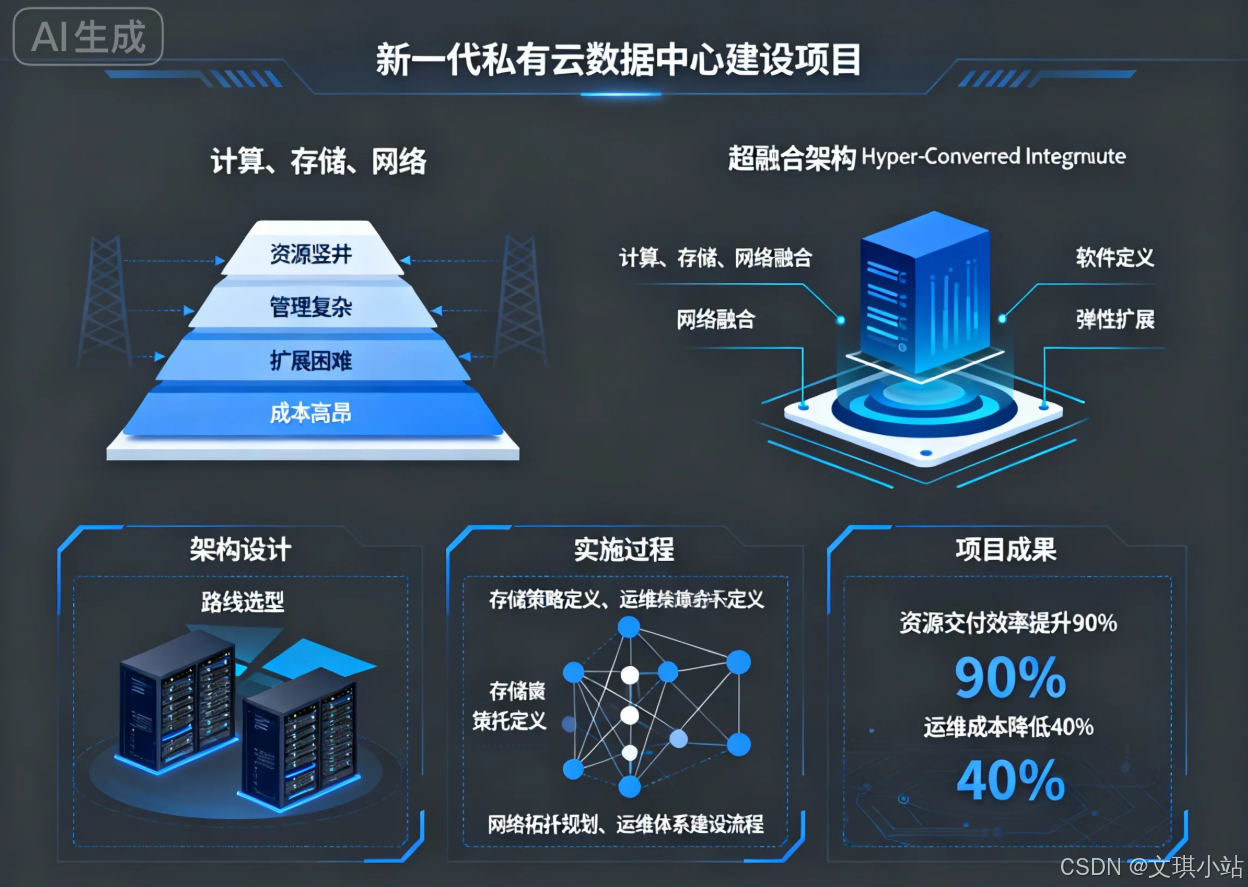 2020年6月,我所在集团为加速数字化转型进程,应对传统IT基础设施的诸多挑战,决定启动"新一代私有云数据中心"的建设项目。本人在该项目中荣幸地担任系统架构师,全面负责新数据中心的技术路线选型、整体架构设计以及关键技术方案的制定与落地。传统"计算、存储、网络"三层式架构存在资源竖井、管理复杂、扩展困难及总体拥有成本高昂等问题,已成为制约业务敏捷发展的瓶颈。本文将结合该项目实践,深入论述我们如何运用超融合架构(Hyper-Converged Infrastructure)进行新一代数据中心的设计与应用。在架构设计阶段,我们系统性地分析了超融合架构的核心原理,对比了其与传统及融合架构的优劣,并基于业务负载特性设计了计算、存储、网络及管理等多个层面的具体方案。在实施过程中,我们通过精细化的存储策略定义、高可用的网络拓扑规划和自动化的运维体系建设,成功构建了一个高效、弹性、易于管理的私有云平台。项目上线后,资源交付效率提升了近90%,运维成本降低了约40%。实践证明,超融合架构是构建现代化、软件定义数据中心的理想基石,能够有效提升企业IT支撑能力。