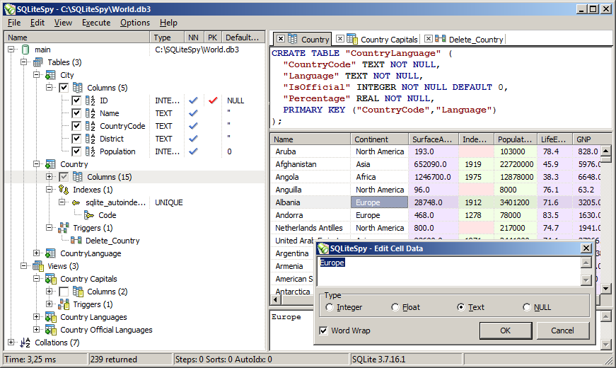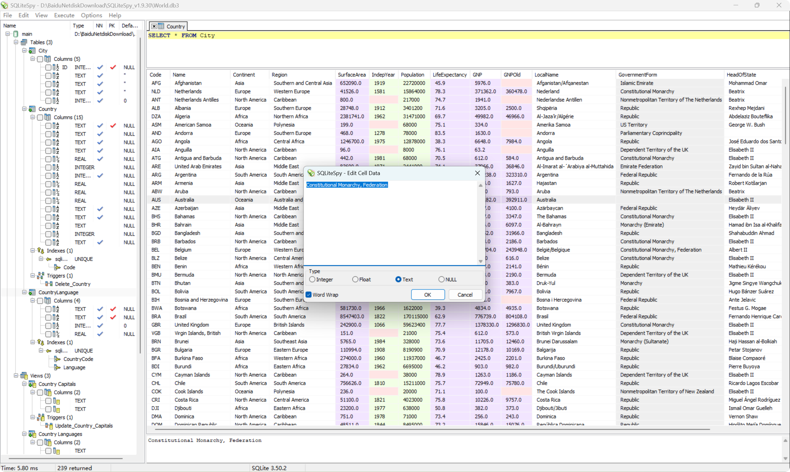 SQLiteSpy 是一款快速、轻量级的免费 SQLite 管理工具,提供了图形化的数据操作界面。