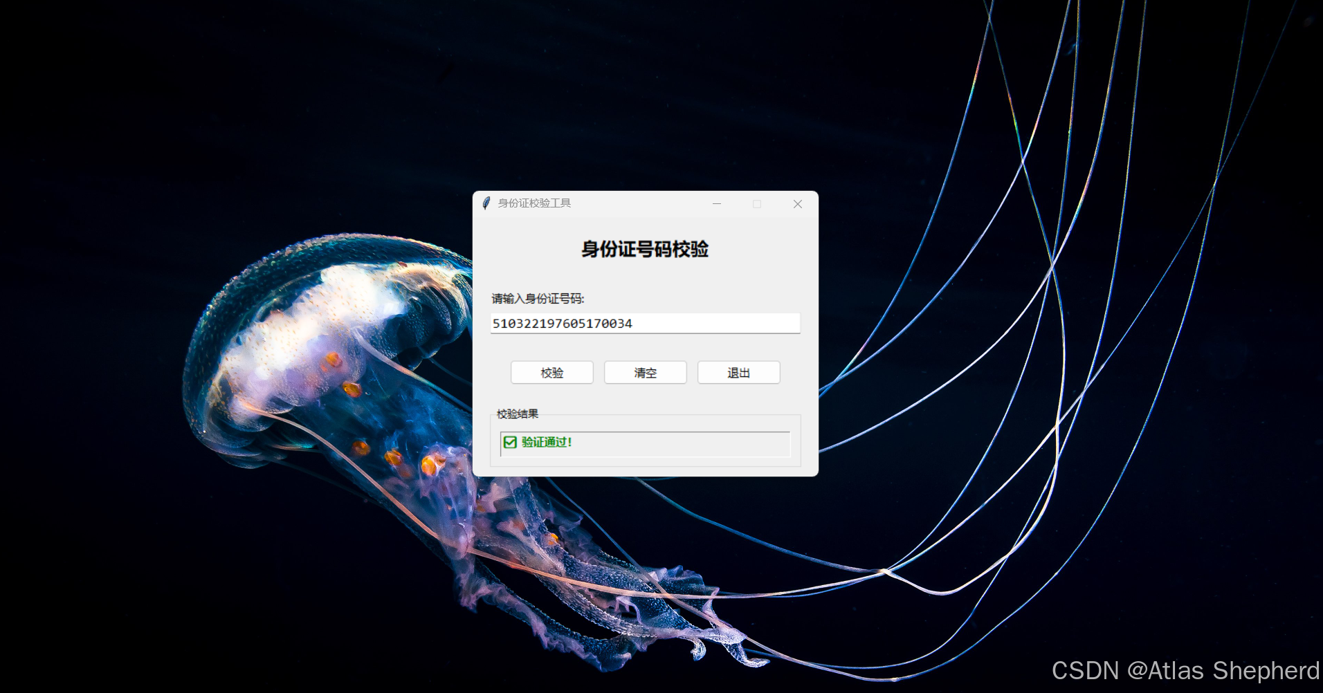 运行此程序将打开一个图形窗口,您可以输入身份证号码进行实时验证。程序会自动检查号码格式并显示详细的验证结果。