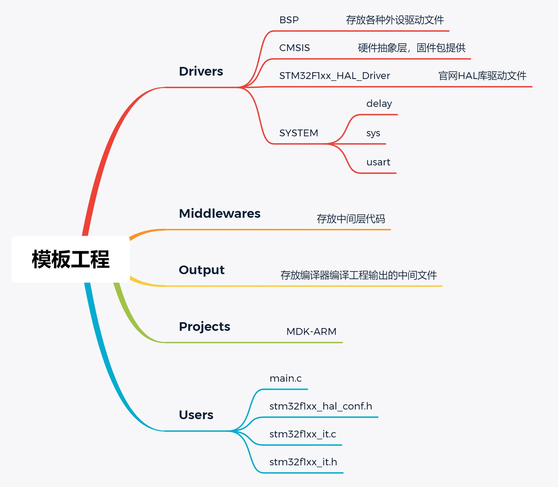 - BSP 存放开发板级支持包驱动代码,如各种外设驱动