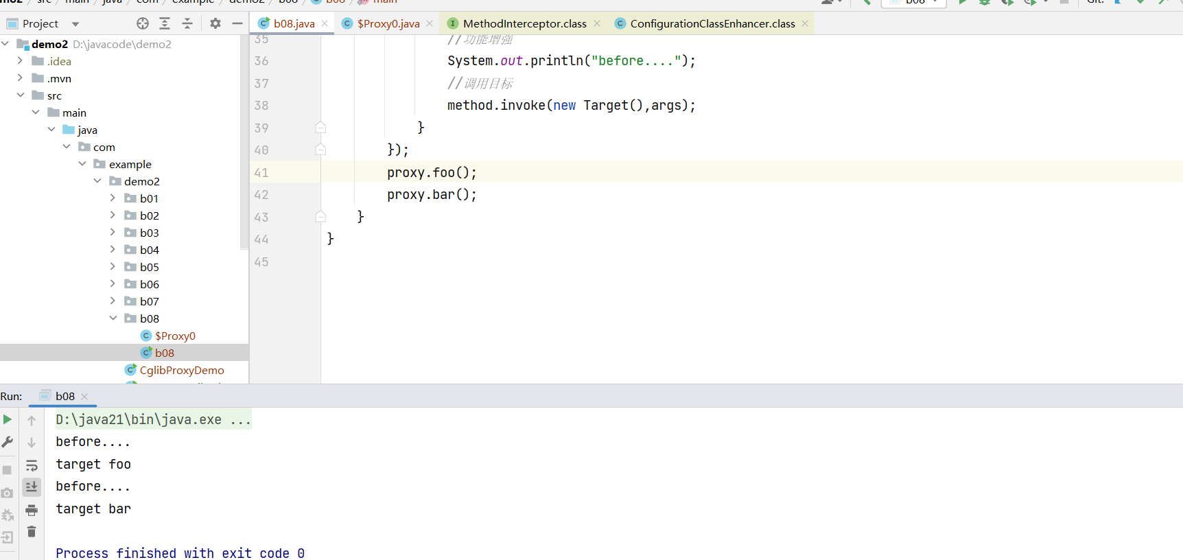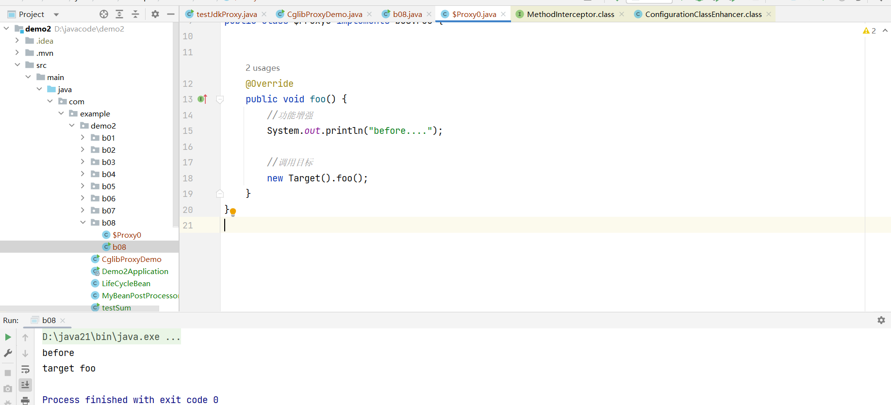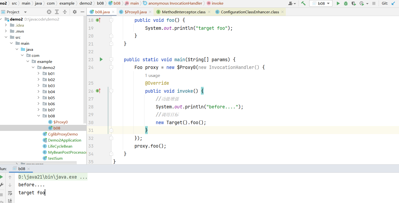 如果有两个方法需要实现代理功能,上面的方法就不适用了。需要进一步改进,在调用invoke方法时候需要把方法信息传入,根据方法的信息执行对应的增强。