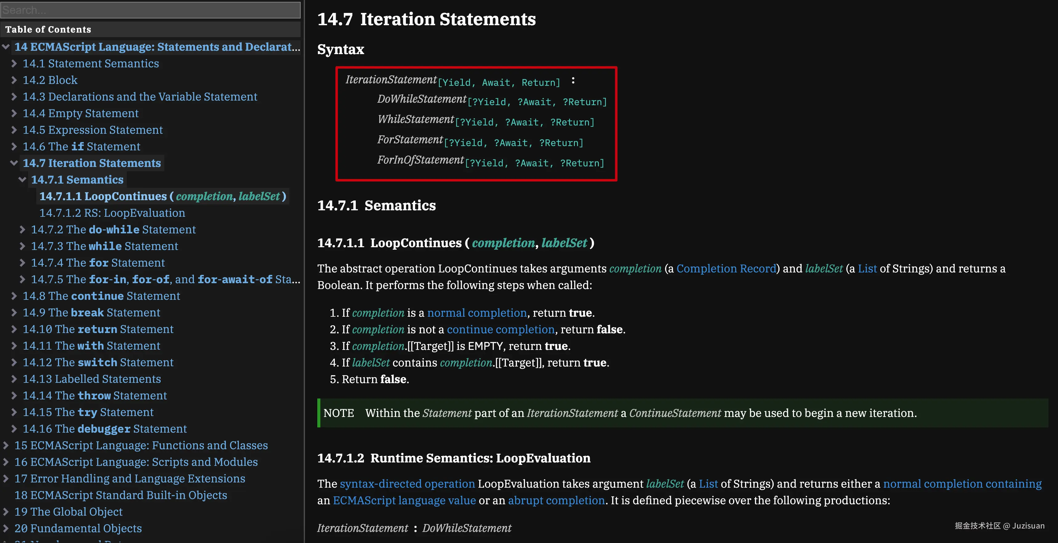 在 ECMAScript 规范中,Iteration Statement(迭代语句)包含 do...while、while、for、for...of、for...in。它们的执行流程会配合 迭代器与生成器 来管理循环:next 决定迭代推进,yield 描述等待点。