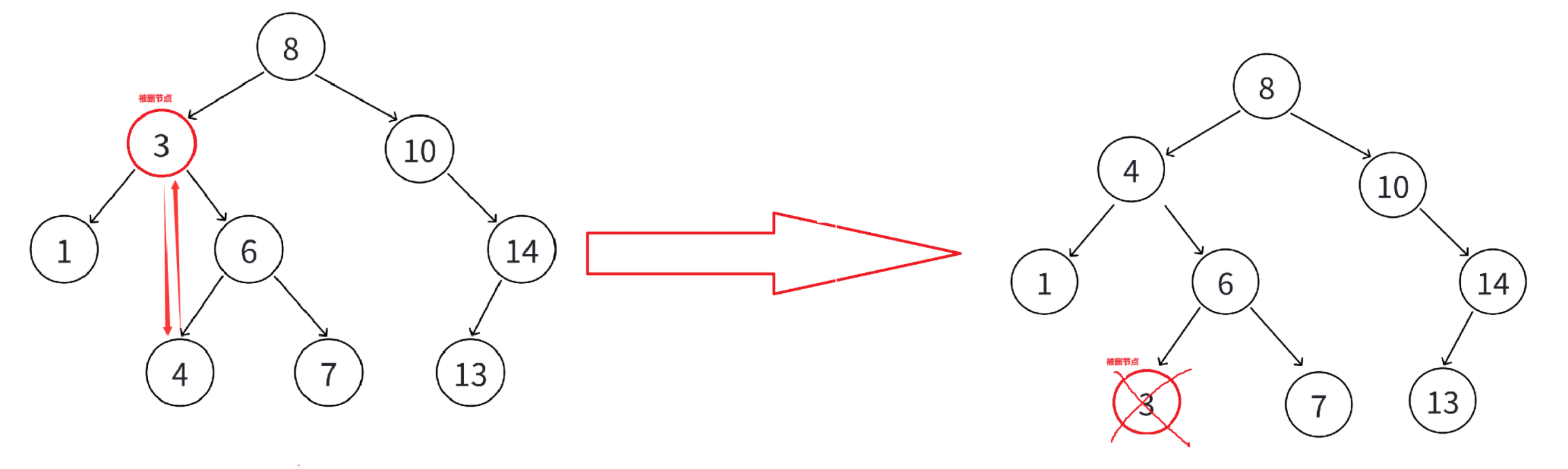 这种情况采用替换法,就是用左子树的****最大结点/或者右子树的****最小结点去替换,交换后,在删除。