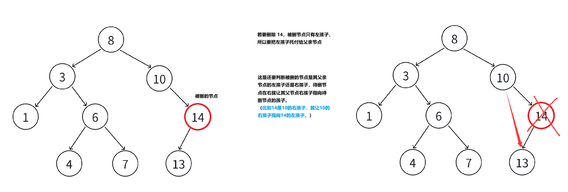 2)被删节点有一个孩子节点(左孩子/右孩子)