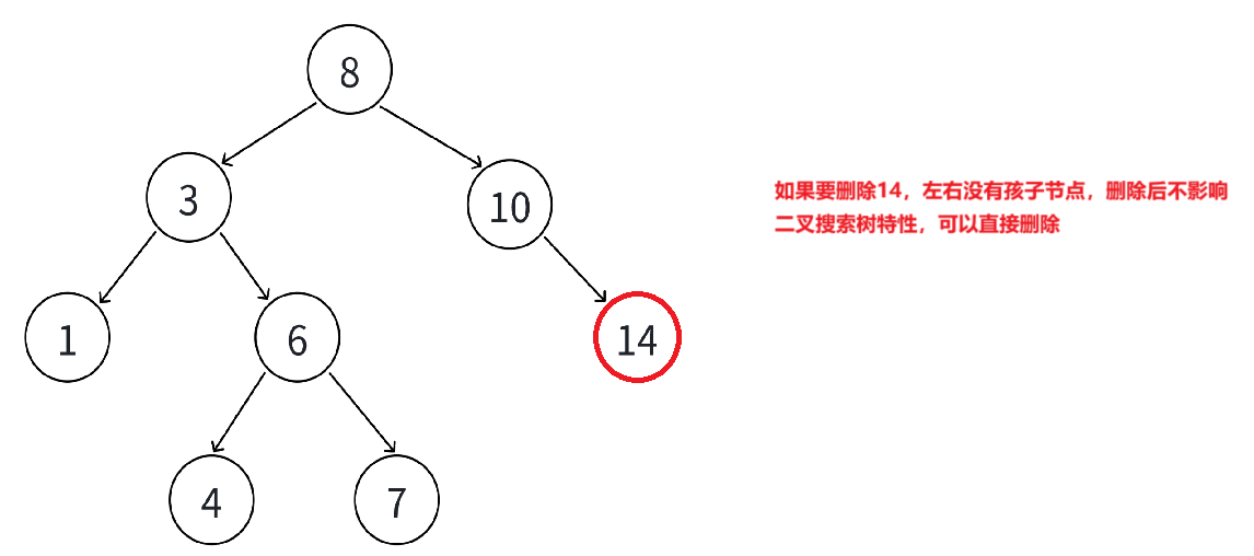 这种情况可直接删除,具体方法:让父亲结点指向空即可,若删除结点在左,那父亲左指向空,反之,父亲右指向空。