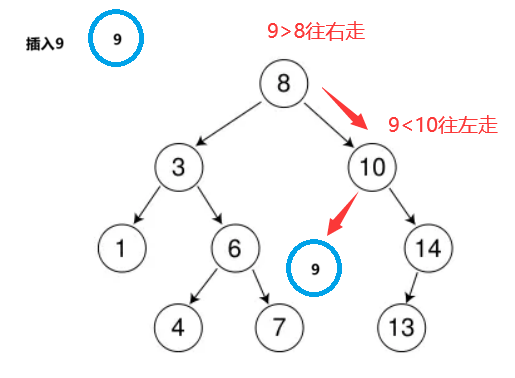 为了保持其"左小右大"的特性,核心思路就是从根节点开始,寻找到一个合适的空位置进行插入。
