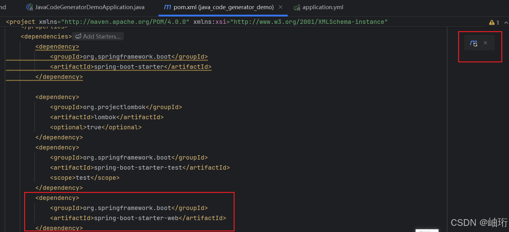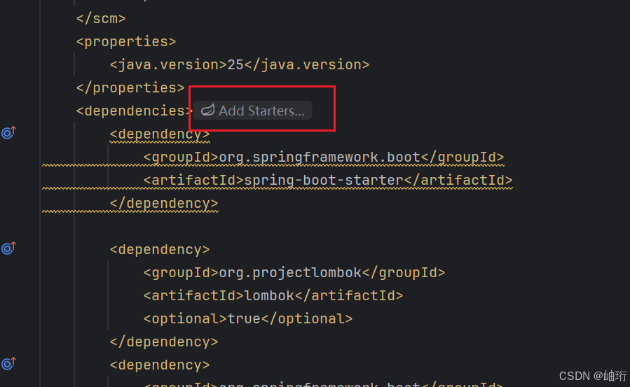 添加依赖还有一个快捷方式,在pom.xml文件中有一个按钮,如下图,点击Add Starters...