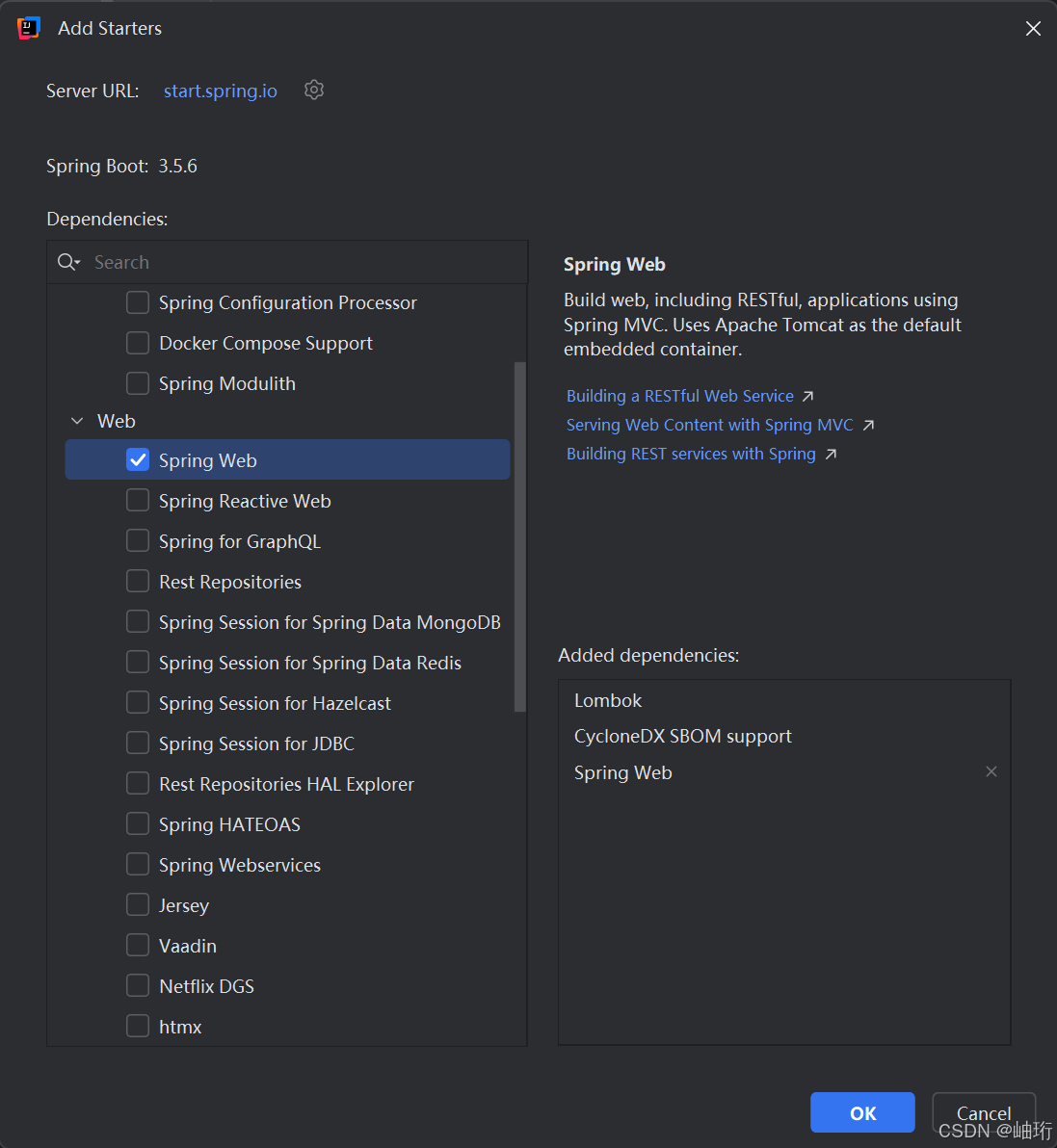 会弹出添加启动依赖的界面,勾选Web下的Spring Web,然后OK即可添加web依赖