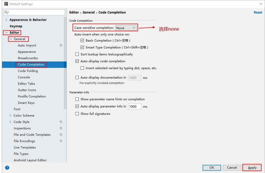 选择 Editor->General->Code Completion 下设置 Case sensitive completion 为 none