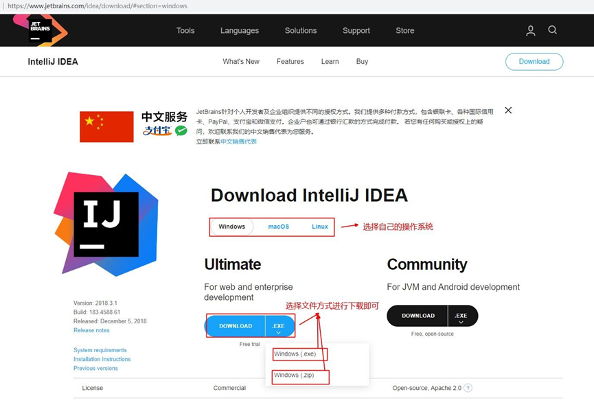 选择对应的操作系统版本,下载 idea 开发工具。可以选择.exe 和.zip 对应的版本进行下载