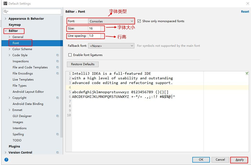 选择 EditoràFont 选择,进行字体和大小的设置。