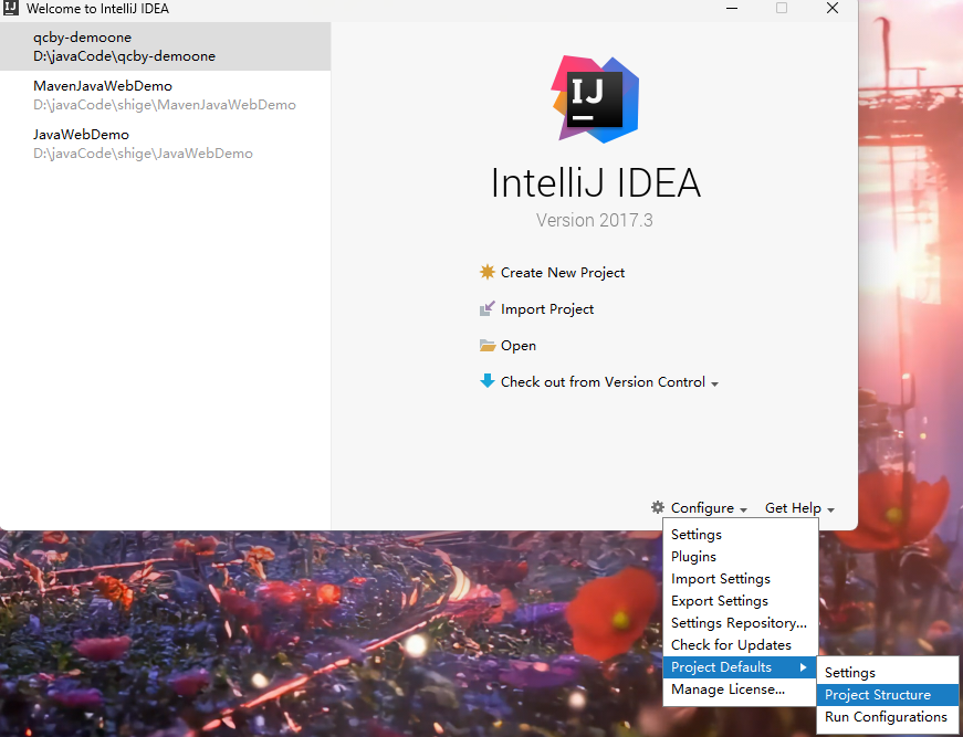 使用idea开发代码,需要配置jdk的开发环境,请参考下面的配置。 在idea 开始界面,选择Configure下的ProjectDefaults 下的 ProjectStructure 进行配置,如下 图所示。