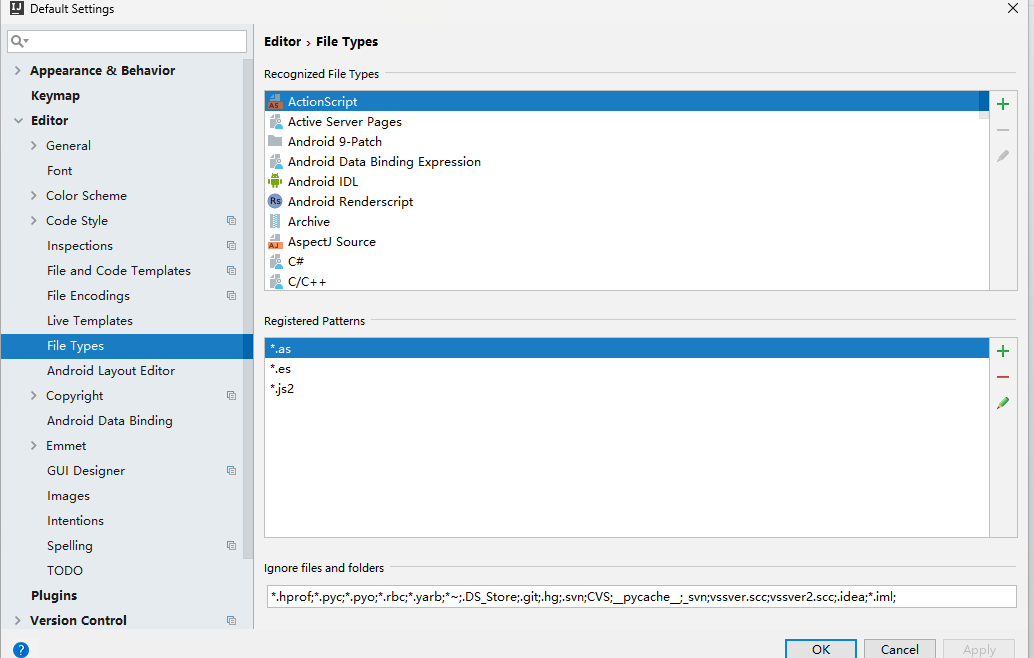 IntelliJ IDEA 项目会自动生成一个.idea 文件夹和.iml文讲,看着实在是碍眼, 所以对以上文件进行隐藏处理 在Editor->File Types 下的"Ignore files and folders"一栏添加 *.idea;*.iml;等 配置如下图所示