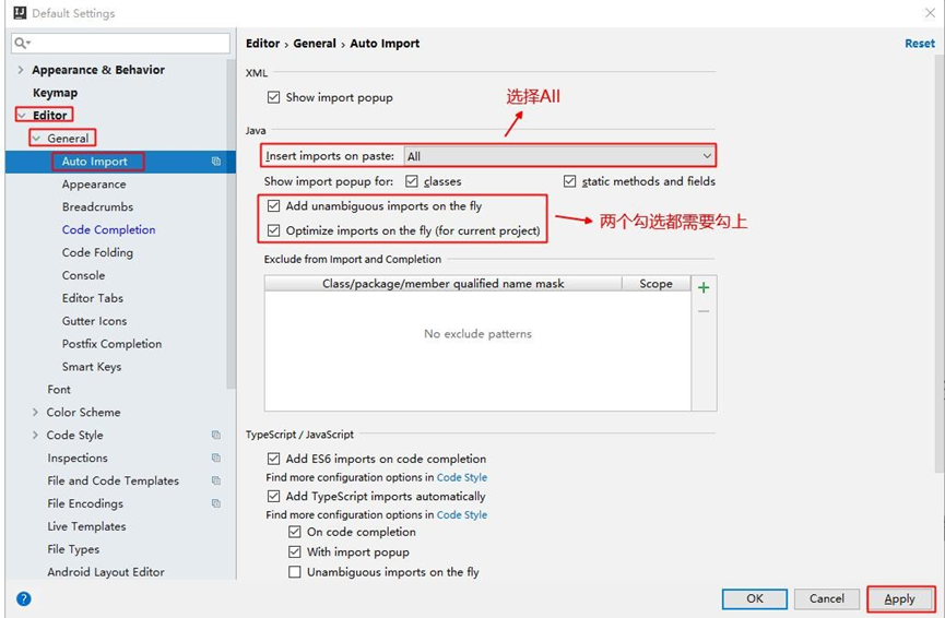 假如把一些类拷贝到咱们工程中,也想默认导入包,请参考如下设置。选择 Editor->General->AutoImport,按下面图片进行设置。