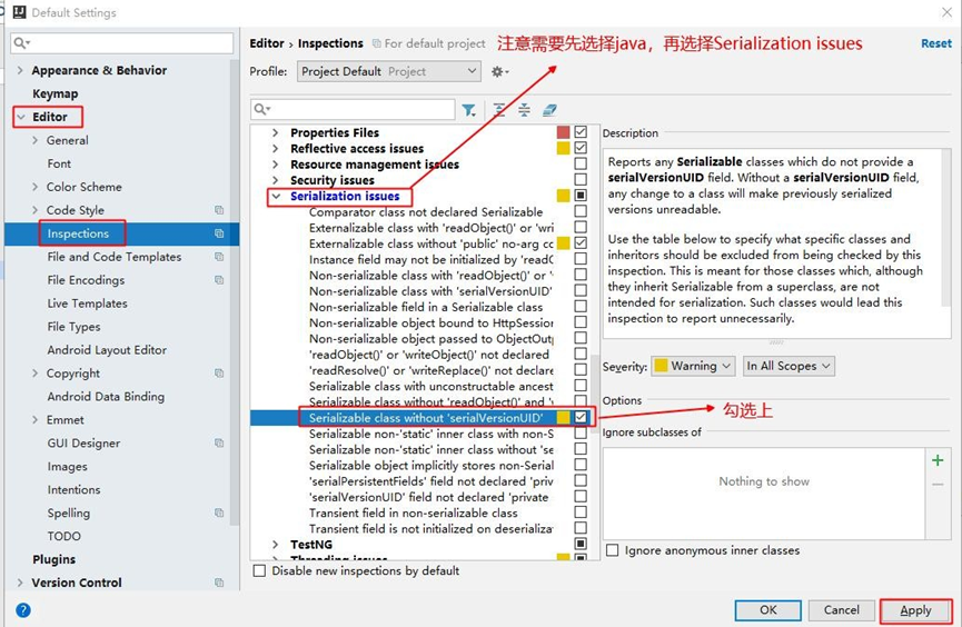 Editor->Inspections 下勾选中 Java->Serialization issues->Serializable class