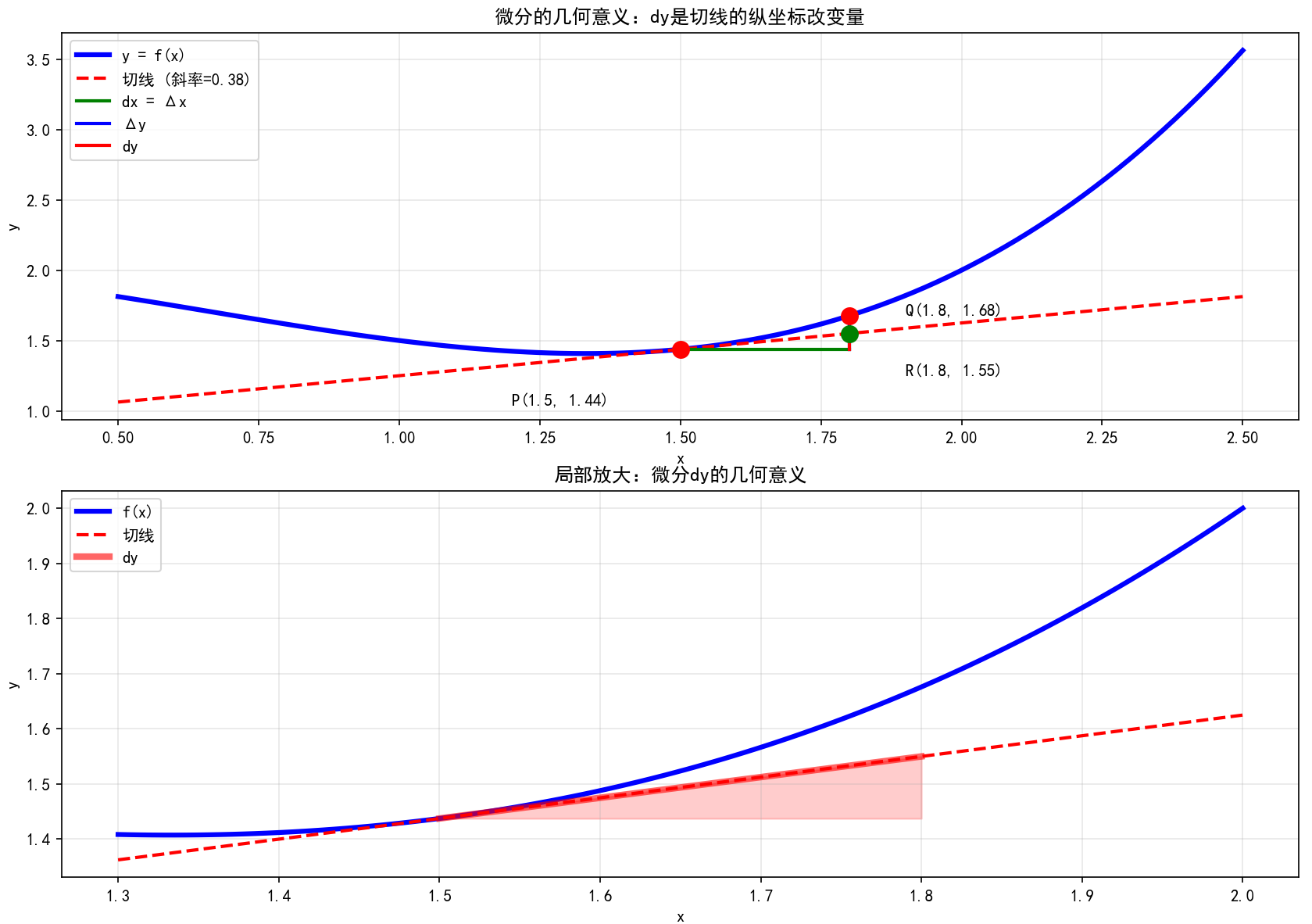 微分 dy=f′(x0)dxdy = f'(x_0)dxdy=f′(x0)dx 的几何意义是:它表示曲线 y=f(x)y = f(x)y=f(x) 在点 (x0,f(x0))(x_0, f(x_0))(x0,f(x0)) 处切线的纵坐标改变量。