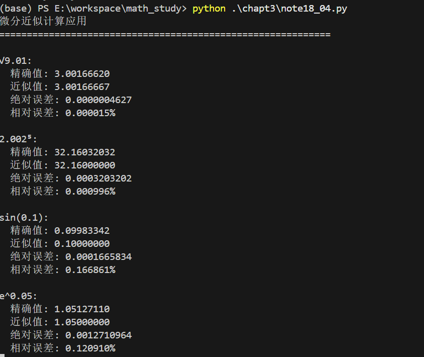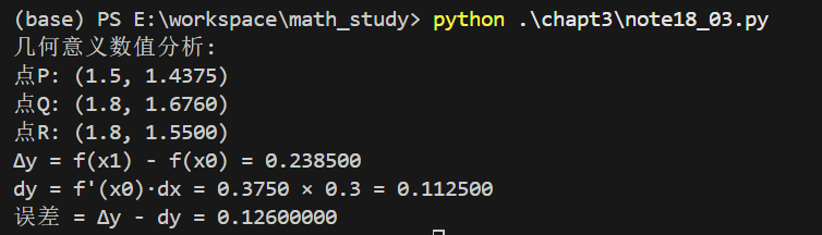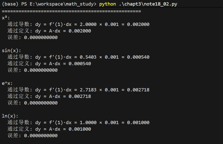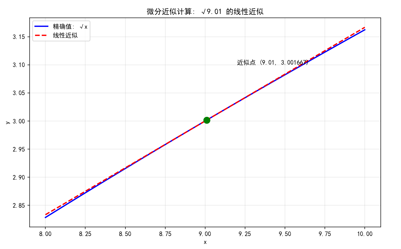 print(f" 通过导数: dy = f'({x0})·dx = {deriv(x0):.4f} × {dx} = {dy_through_derivative:.6f}")