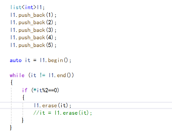然后就是对于我们要连续对数据进行删除,然后使用迭代器的问题,前面我们学习vector类的时候讲过迭代器失效的问题,如下面这种情况就会出现: