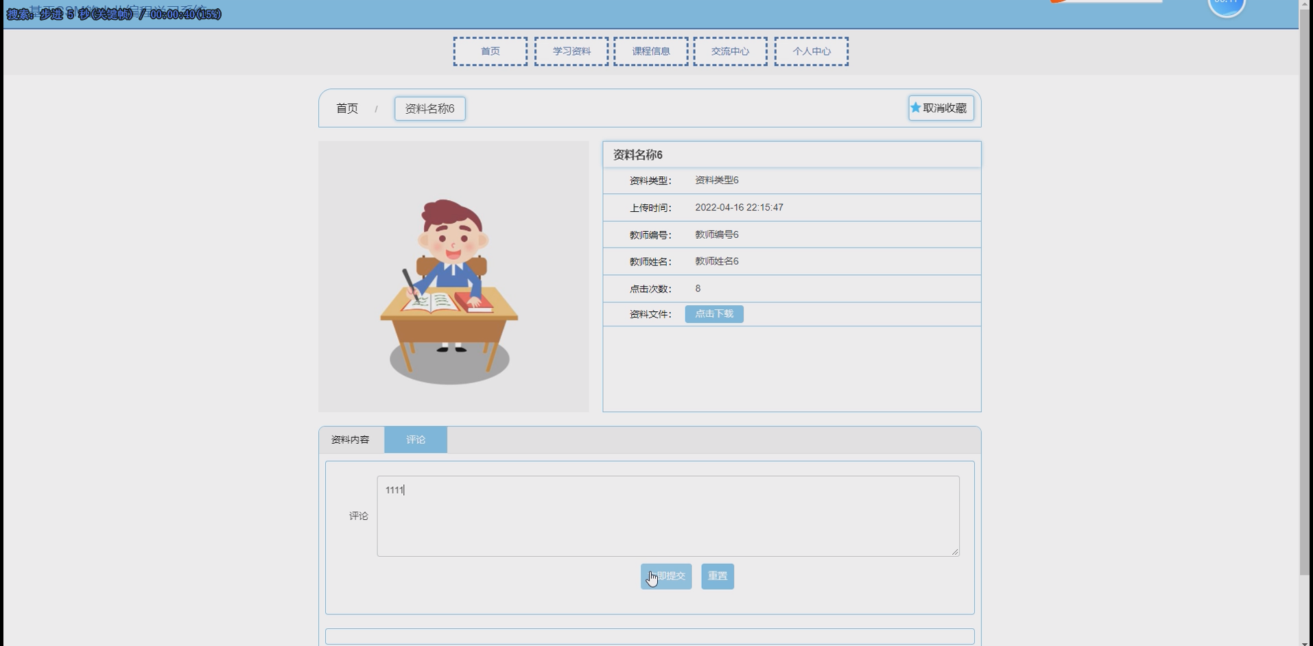 - 资料展示:系统按资料类型展示学习资料,包括资料名称、简介、上传时间、文件大小等信息。