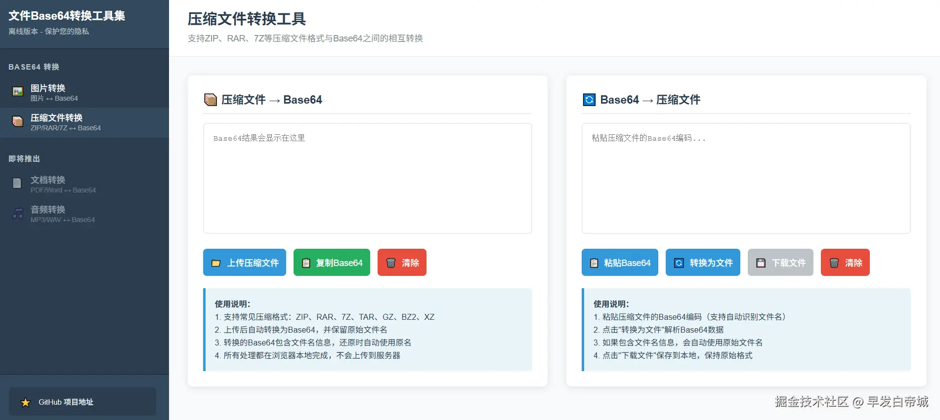在日常使用中发现,原有的"图片 ↔ Base64 离线转换工具"已经无法满足更复杂的场景。尤其是在需要处理压缩包、文档等非图片文件时,单个图片转换工具的局限性变得明显。为此,我开发了全新的"文件Base64转换工具集合",为用户带来更强大、更便捷的文件转换体验,方便一次性处理多个文件。