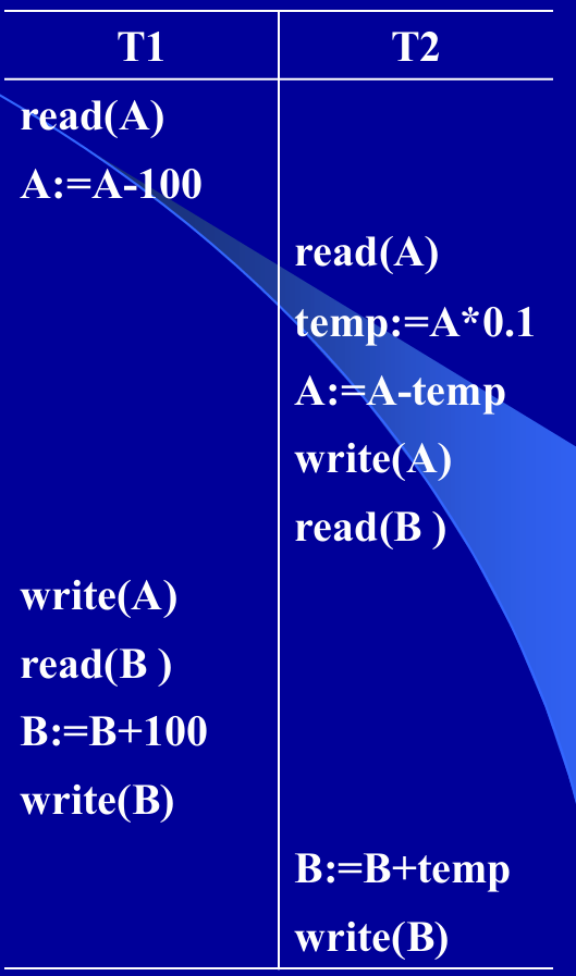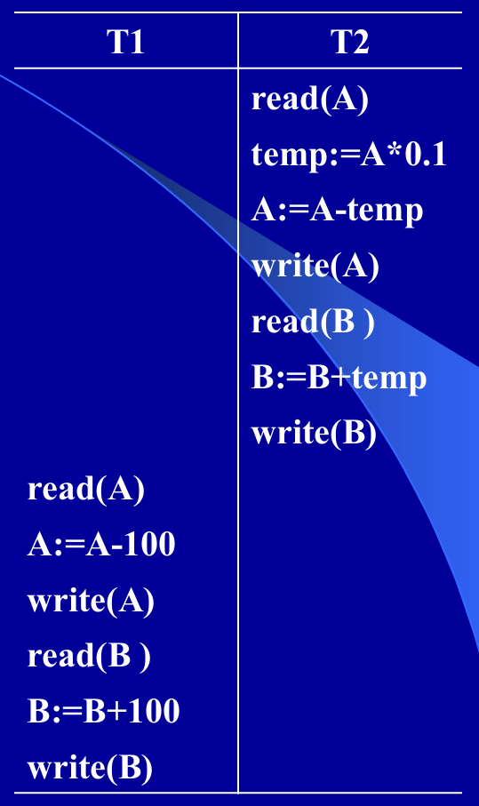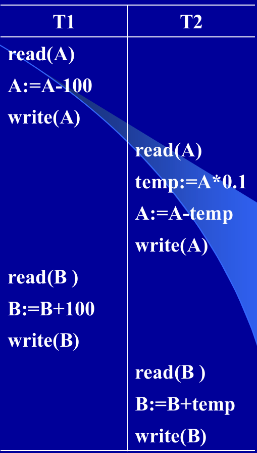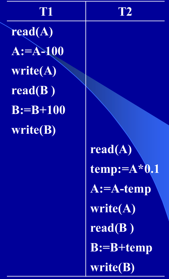 例:事务T1从帐号A转¥100到帐号B,事务T2从帐号A转 10%到帐号B。