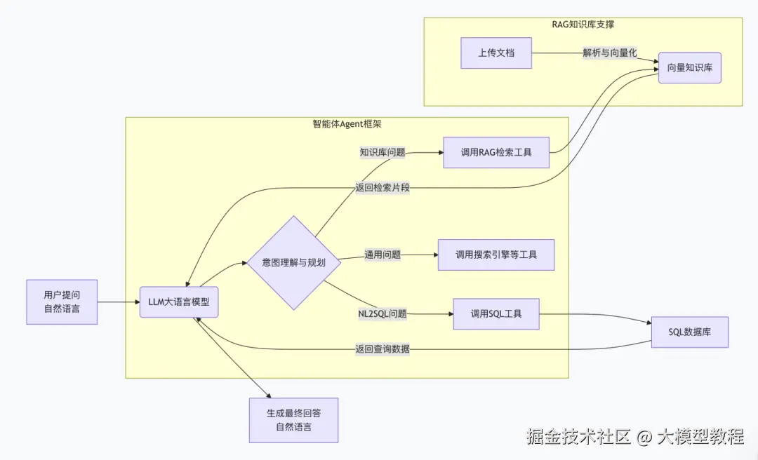 对于像NL2SQL这样的复杂任务,Agent框架会开始工作。LLM首先会进行"意图理解",判断用户问题需要调用哪个工具(这里是SQL工具)。然后,LLM会根据数据库的表结构(Schema)生成准确的SQL查询语句。