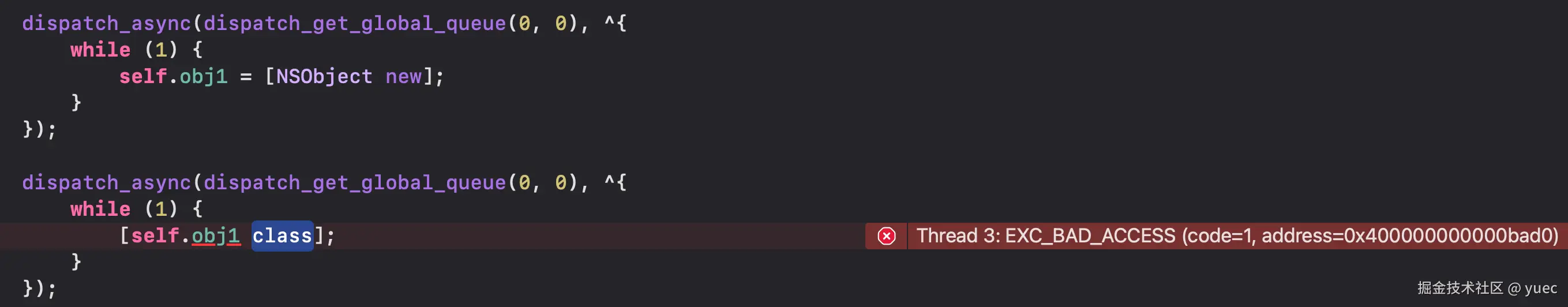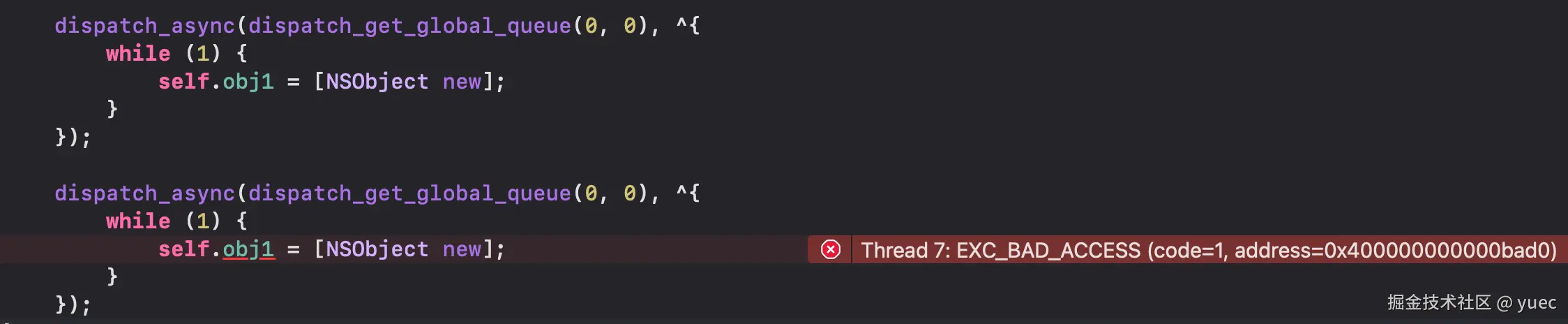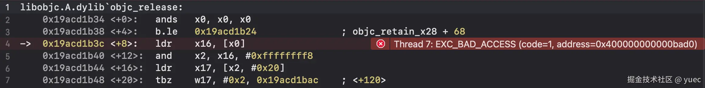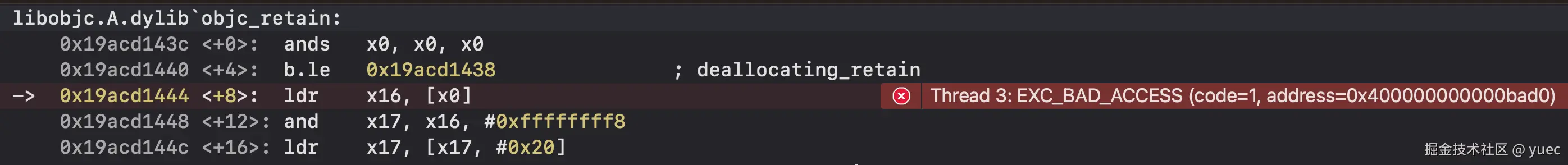 崩溃:ARC 为了保证对象生命周期,会对这个值执行 retain 操作。这导致系统调用 objc_retain(0x4...bad0)。同样,由于这是一个无效地址,程序崩溃,堆栈栈顶指向 objc_retain。