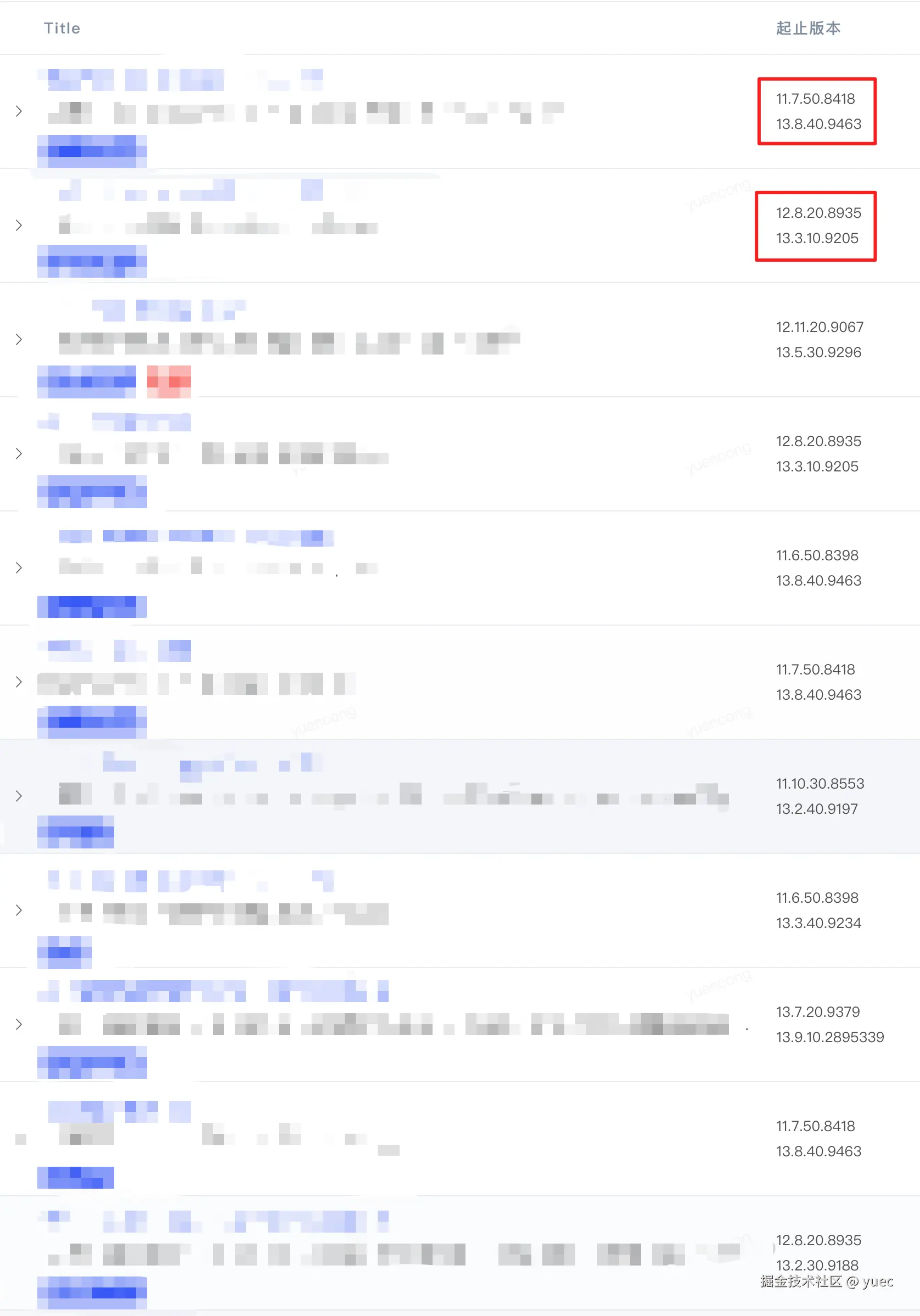 这是一次由操作系统 Runtime 变更引发的、波及全量线上版本的崩溃问题。当用户升级操作系统后,代码库中所有潜藏的 nonatomic 数据竞争问题都将被新的"哨兵"机制主动暴露,导致崩溃呈现高度分散的特点,增加了问题处置的复杂性。如下所示,不仅分布为多个崩溃堆栈,并且每个堆栈的 App 版本跨度非常大。