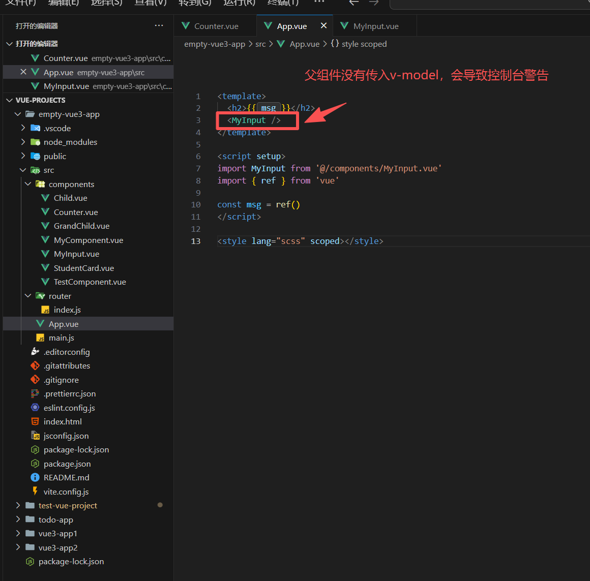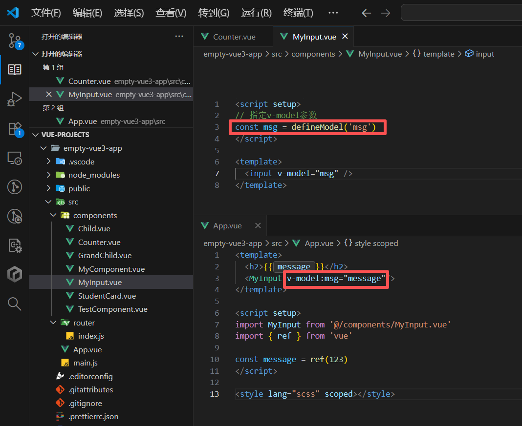 <MyInput :modelValue="msg" @update:modelValue="$event => (msg = $event)" />