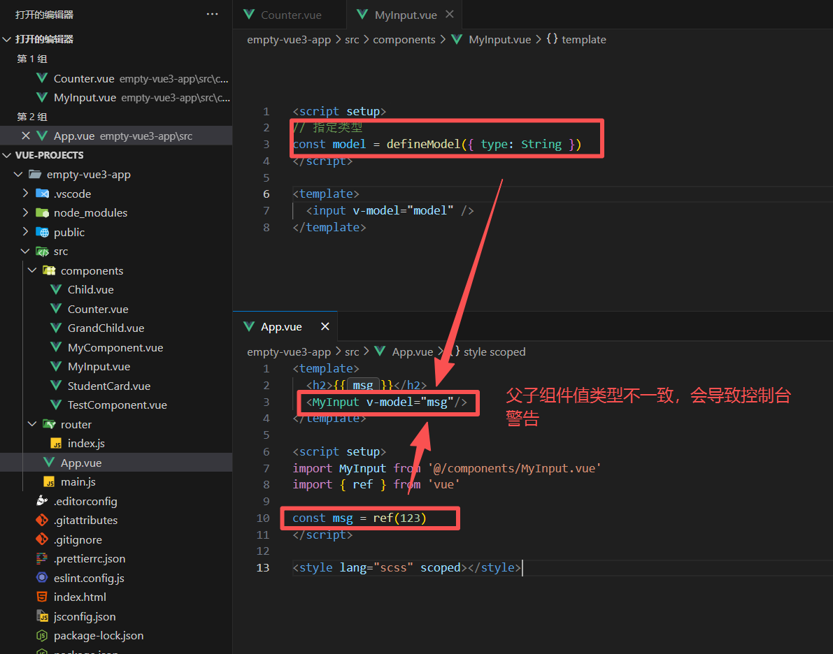 - [3.2.1 使用方式(从 defineModel() 解构,并且在 set 中自定义修饰符行为)](#3.2.1 使用方式(从 defineModel() 解构,并且在 set 中自定义修饰符行为))