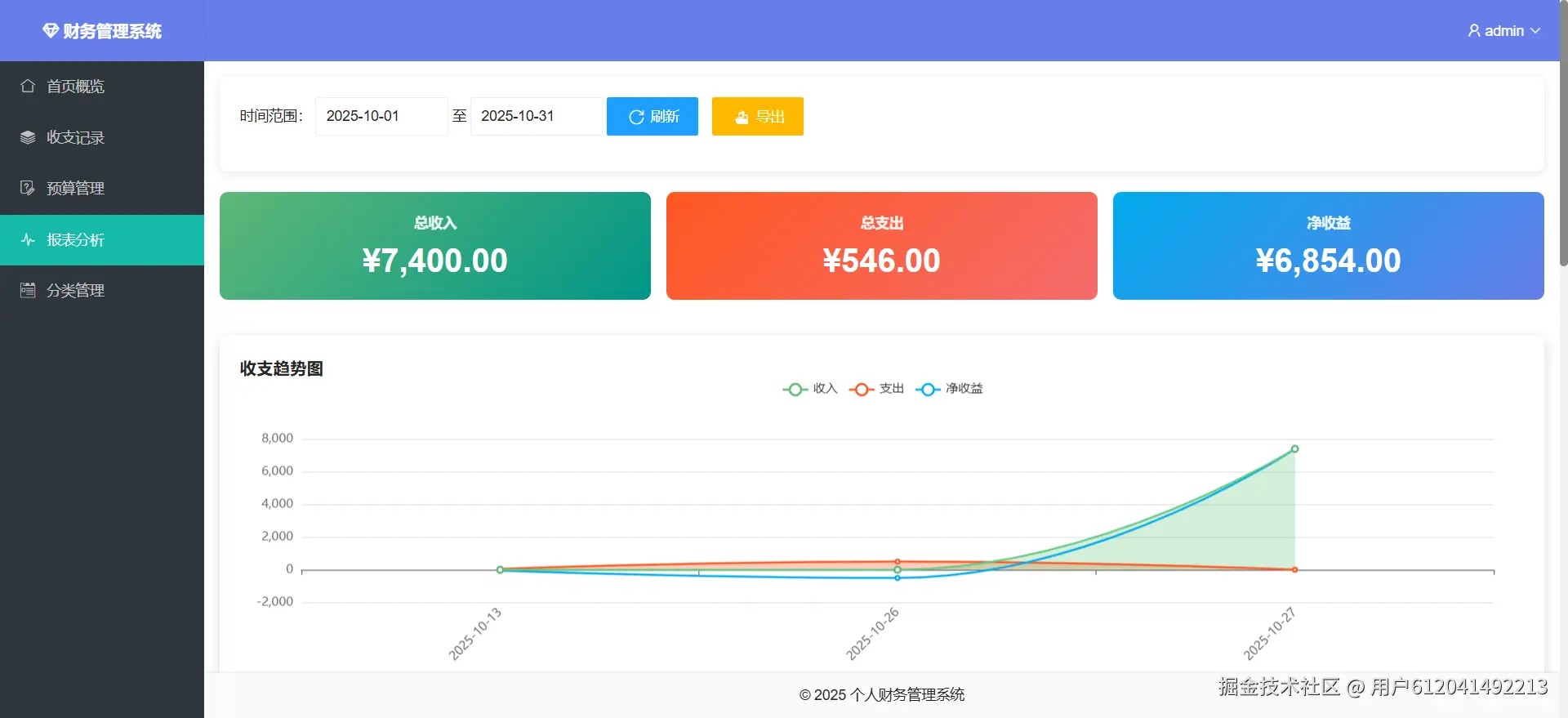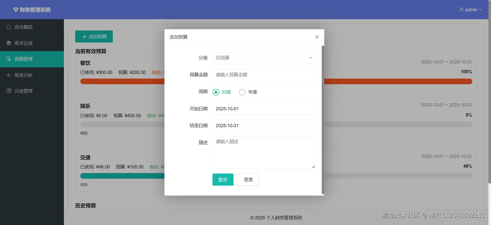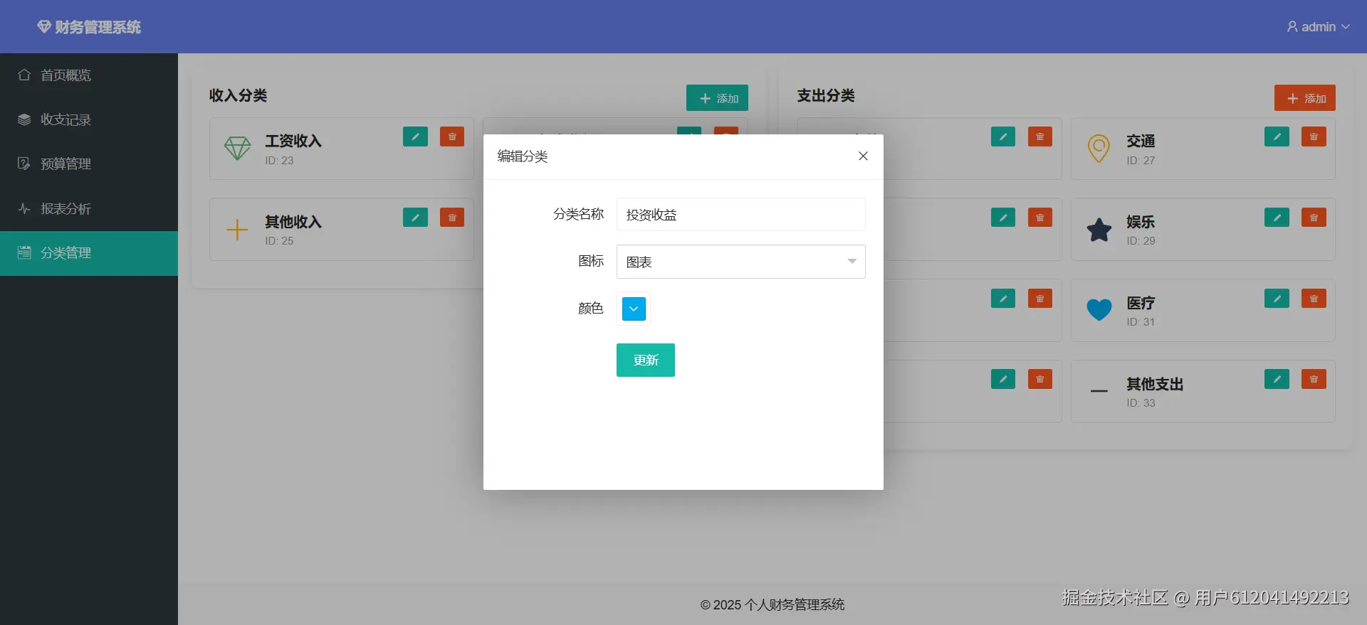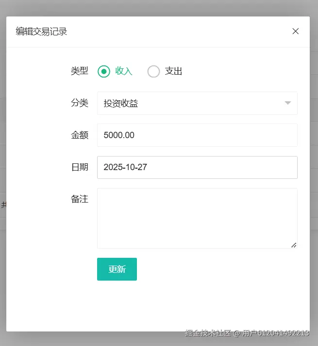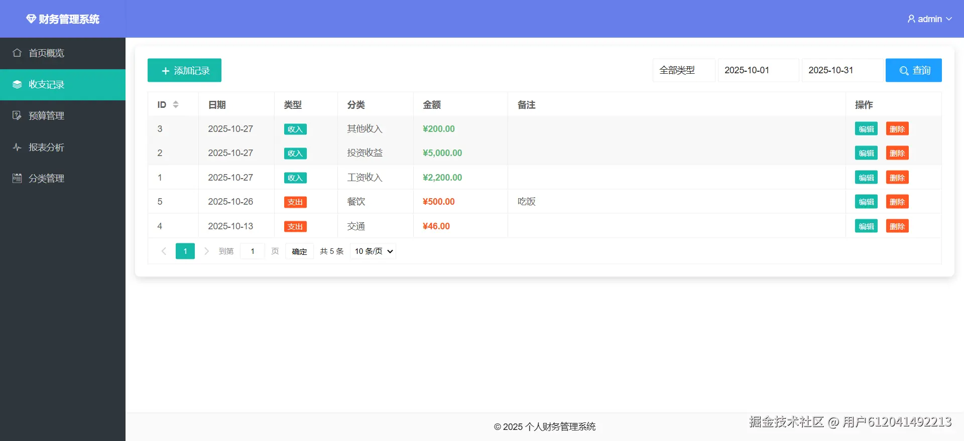json{ "userId": 1, "categoryId": 1, "type": "income", "amount": 5000.00, "description": "工资", "transactionDate": "2025-10-27" }