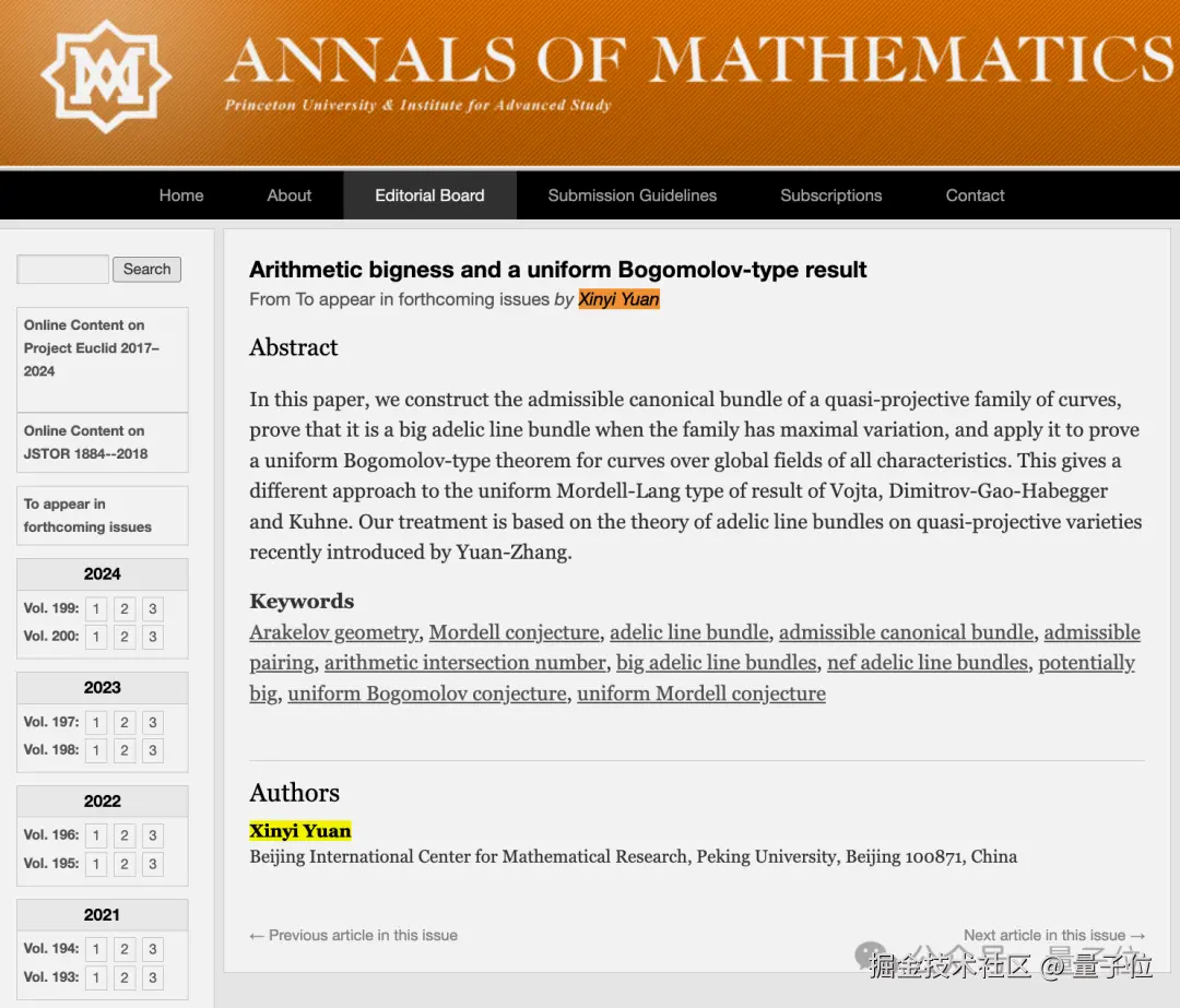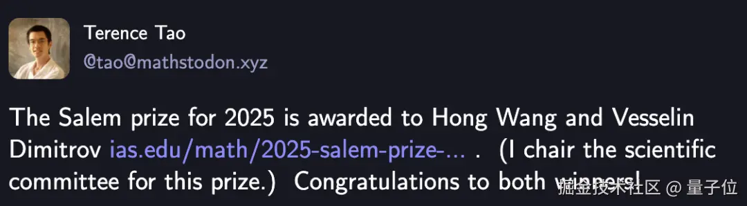 1\][2025iccm.simis.cn/site/](https://link.juejin.cn?target=https%3A%2F%2F2025iccm.simis.cn%2Fsite%2F "https://2025iccm.simis.cn/site/") \[2\][www.ias.edu/math/2025-s...](https://link.juejin.cn?target=https%3A%2F%2Fwww.ias.edu%2Fmath%2F2025-salem-prize-winners "https://www.ias.edu/math/2025-salem-prize-winners") \[3\][mathstodon.xyz/@tao/115447...](https://link.juejin.cn?target=https%3A%2F%2Fmathstodon.xyz%2F%40tao%2F115447803796232284 "https://mathstodon.xyz/@tao/115447803796232284") \[4\][qzc.tsinghua.edu.cn/info/1195/4...](https://link.juejin.cn?target=https%3A%2F%2Fqzc.tsinghua.edu.cn%2Finfo%2F1195%2F4666.htm "https://qzc.tsinghua.edu.cn/info/1195/4666.htm") \[5\][mp.weixin.qq.com/s/qUjrnPpTf...](https://link.juejin.cn?target=https%3A%2F%2Fmp.weixin.qq.com%2Fs%3F__biz%3DMzIzNjc1NzUzMw%3D%3D%26mid%3D2247781048%26idx%3D1%26sn%3D096cb0109bbcbdb4c2d90ca372957870%26scene%3D21%23wechat_redirect "https://mp.weixin.qq.com/s?__biz=MzIzNjc1NzUzMw==&mid=2247781048&idx=1&sn=096cb0109bbcbdb4c2d90ca372957870&scene=21#wechat_redirect") \[6\][mp.weixin.qq.com/s/1sftTzh7O...](https://link.juejin.cn?target=https%3A%2F%2Fmp.weixin.qq.com%2Fs%3F__biz%3DMzIzNjc1NzUzMw%3D%3D%26mid%3D2247617601%26idx%3D1%26sn%3D6e7ccaa9d94c31c0206642dd6a0ef8f4%26scene%3D21%23wechat_redirect "https://mp.weixin.qq.com/s?__biz=MzIzNjc1NzUzMw==&mid=2247617601&idx=1&sn=6e7ccaa9d94c31c0206642dd6a0ef8f4&scene=21#wechat_redirect") \[7\][mp.weixin.qq.com/s/oBWq3exr7...](https://link.juejin.cn?target=https%3A%2F%2Fmp.weixin.qq.com%2Fs%3F__biz%3DMzkzMjc2OTE1NQ%3D%3D%26mid%3D2247489181%26idx%3D1%26sn%3D3b939cc66b482226068be8105c2c31e3%26scene%3D21%23wechat_redirect "https://mp.weixin.qq.com/s?__biz=MzkzMjc2OTE1NQ==&mid=2247489181&idx=1&sn=3b939cc66b482226068be8105c2c31e3&scene=21#wechat_redirect") **欢迎在评论区留下你的想法!** --- **完** ---