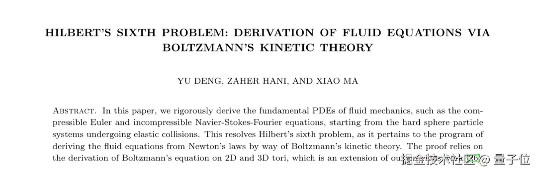 但要从粒子系统→气体动力学→流体力学,期间存在巨大的数学断层,这也导致该问题困扰了数学界一百多年,直到邓煜三人通过稀薄气体硬球模型 和 Boltzmann 方程实现了一条数学严谨的推导链。