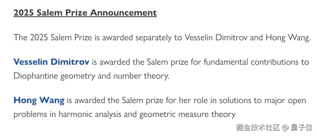 国际数学界的 2025 塞勒姆奖 ,颁发给王虹和 Vesselin Dimitrov。