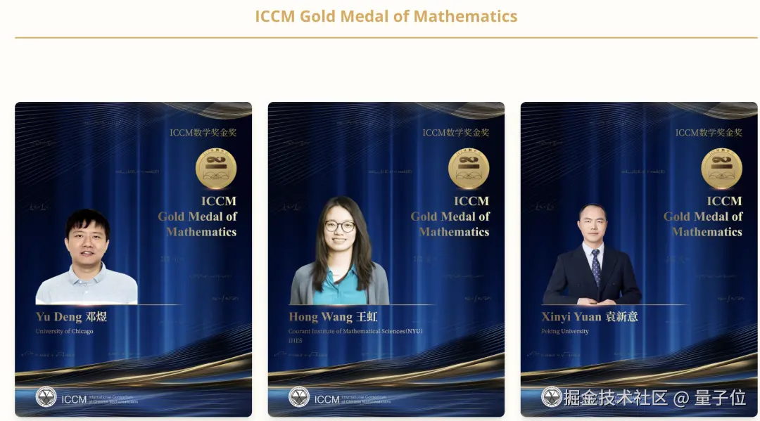 另一边则是世界华人数学家大会 ICCM 数学奖金奖,颁给王虹、邓煜、袁新意,三人都是北大数院校友。