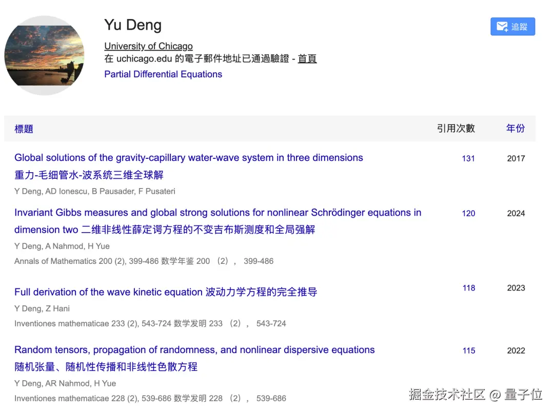 首先是邓煜,现任芝加哥大学教授,毕业于深圳高级中学后,进入北大数院 07 级,在大三时转学到 MIT,并在普林斯顿大学获得博士学位。