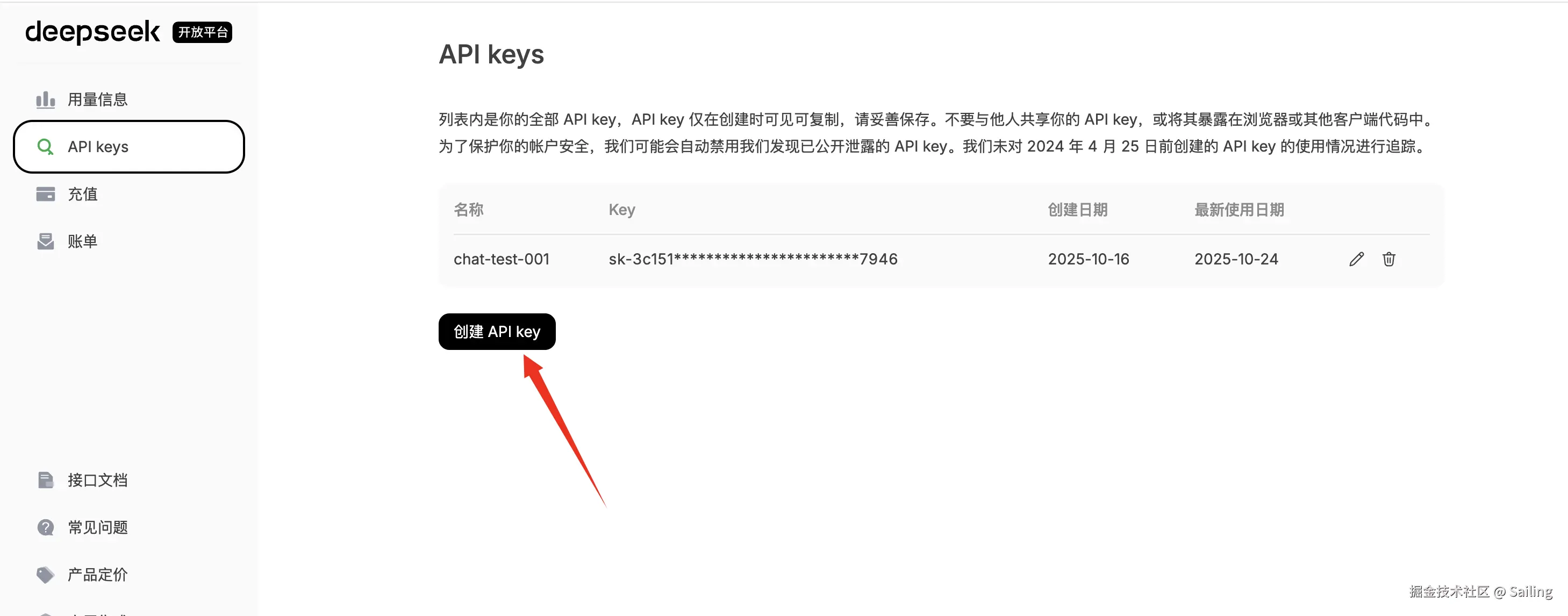 这里我们简单了解下,详见 DeepSeek API 文档。大家先按照下面我写的例子,快速应用看效果。