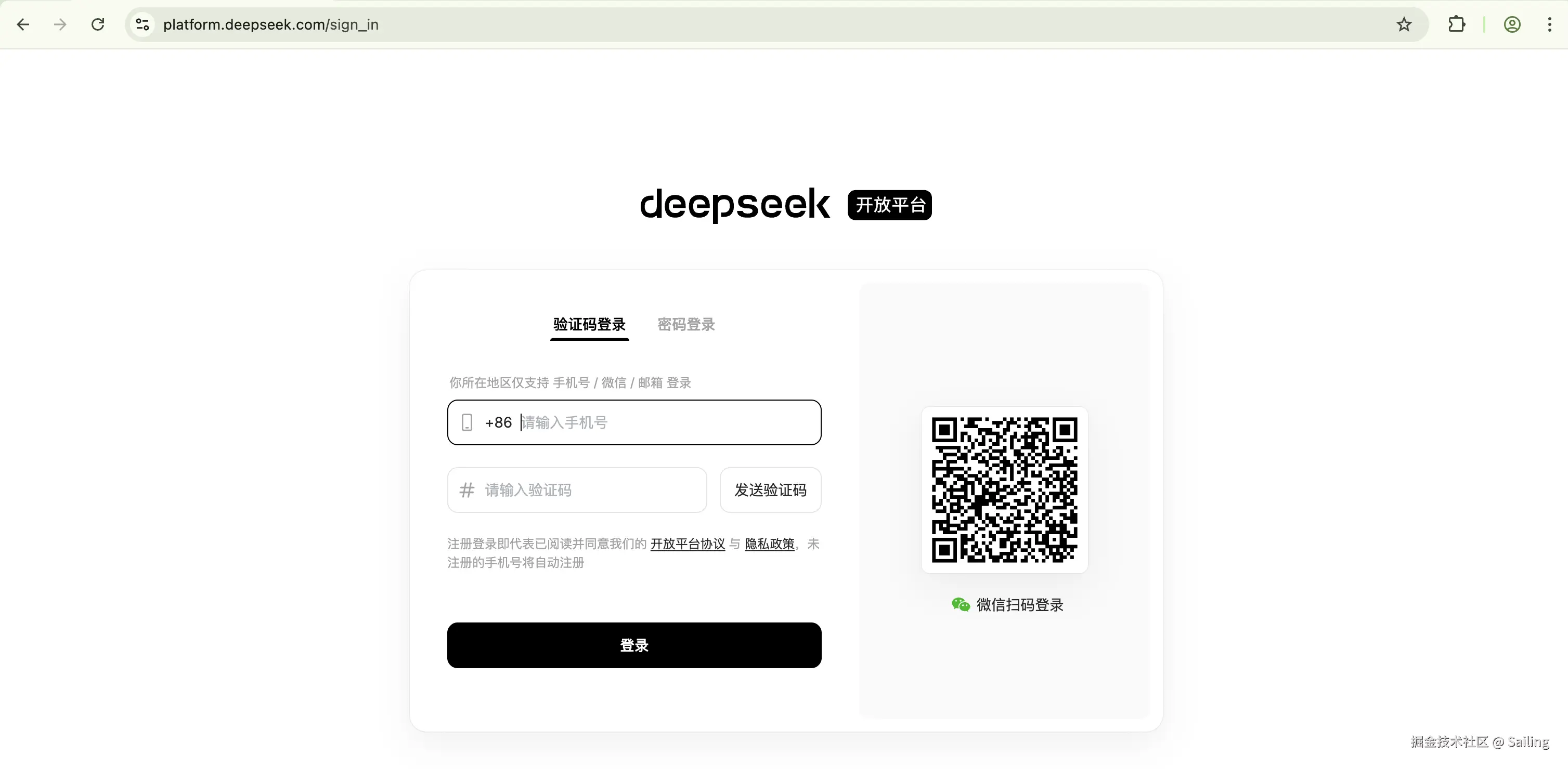 访问 DeepSeek 开放平台,使用手机号、邮箱或 微信登录即可。