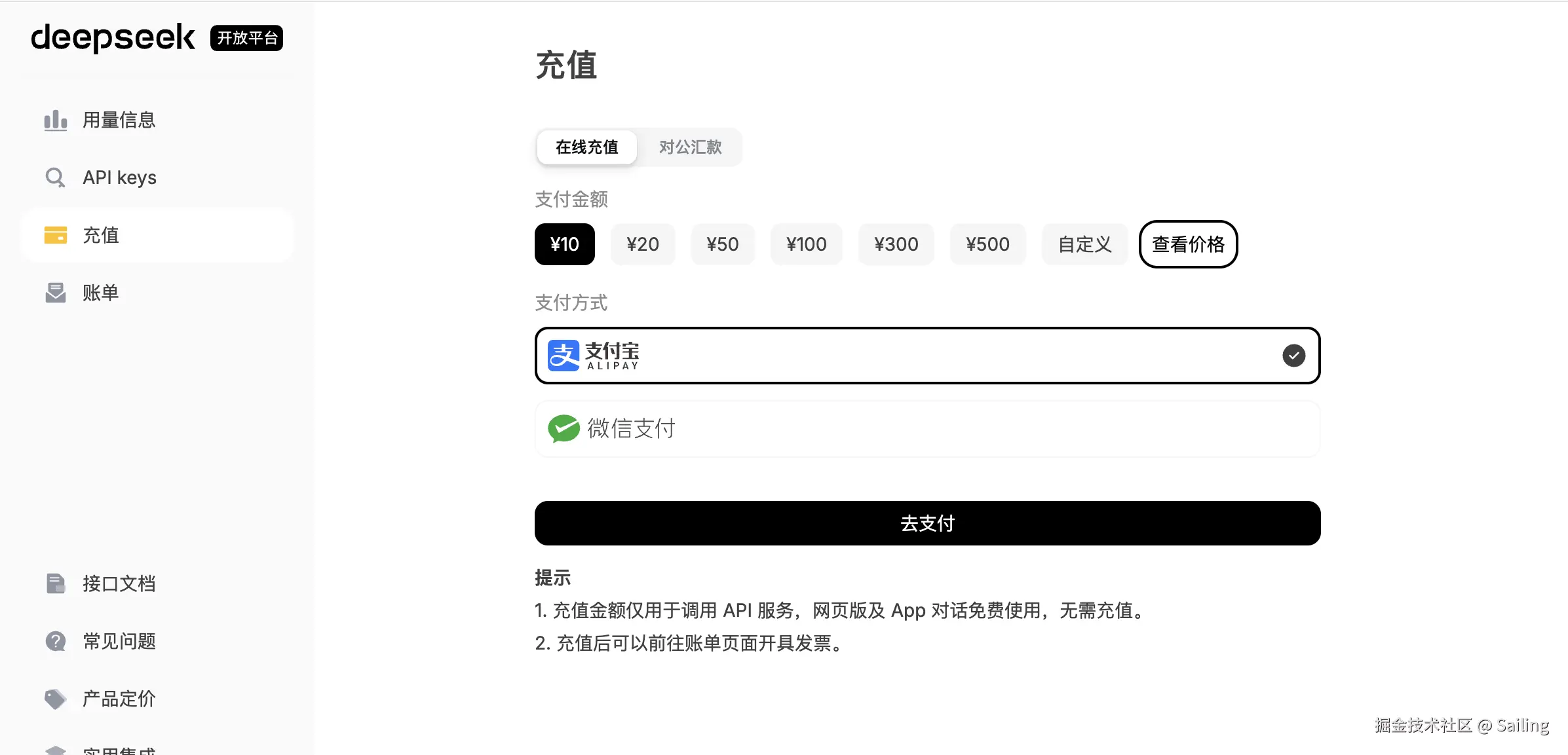 建议:先充值最低额度,方便调试和测试,非常利好开发者。是不是很 nice !
