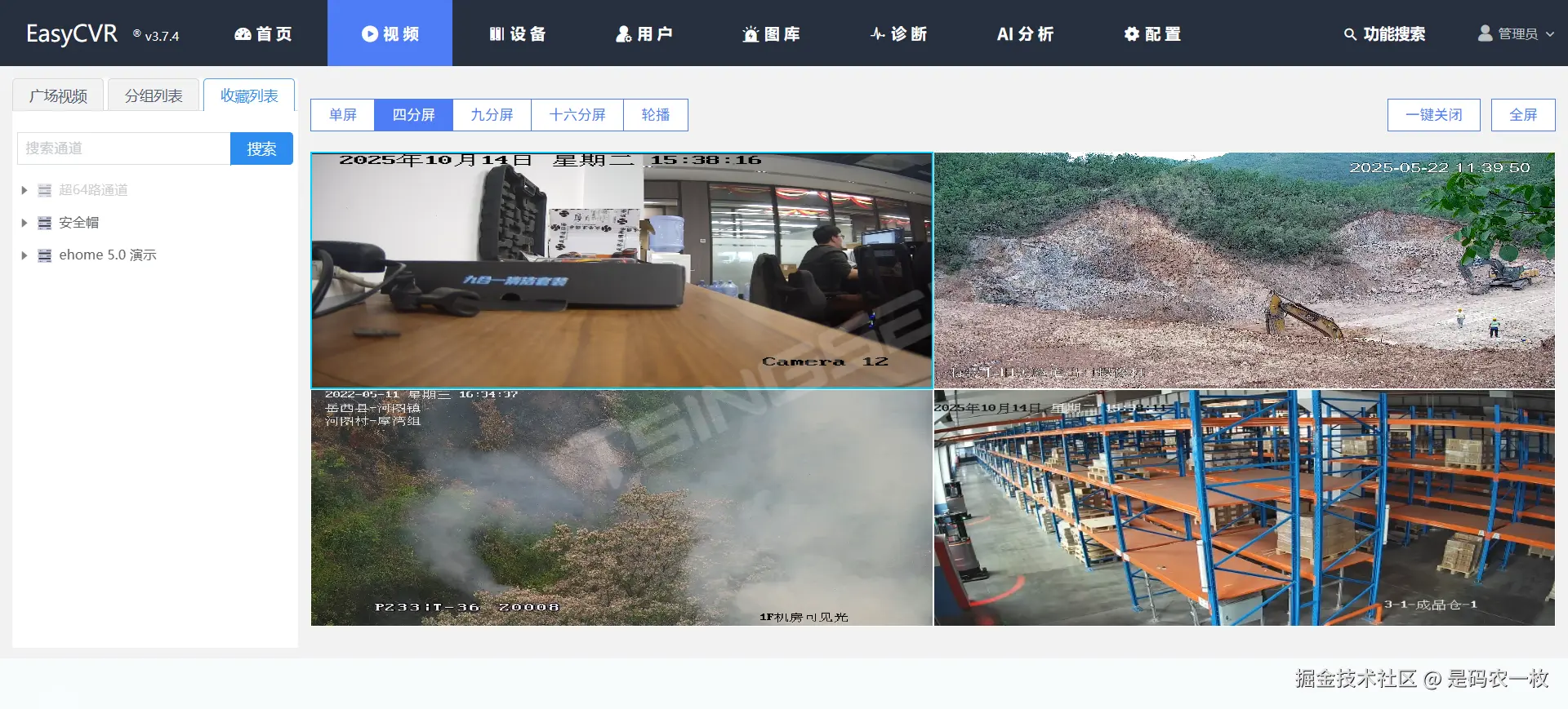 2)远程监控:平台支持7×24小时不间断远程实时监控,满足用户随时查看监控画面的需求。同时,支持多路视频流同时播放,提供1/4/9/16画面分屏及自定义轮播功能。