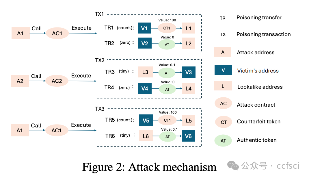 在许多区块链中,例如以太坊、币安智能链 (BSC),钱包地址的主要表示形式是一个难以记忆的 40 位十六进制字符串。因此,用户经常从最近的交易历史记录中选择地址,从而导致区块链地址中毒。攻击者首先生成与受害者之前交互过的地址类似的地址,然后与受害者互动,以"毒害"他们的交易历史记录。其目标是让受害者错误地将代币发送到类似的地址,而不是预期的接收者。与当代研究相比,本文提供了四个显著的贡献。首先,我们开发了一个检测系统,并在两年内对以太坊和 BSC 进行了测量。我们发现的攻击尝试比之前报告的多 13 倍左右------总计 2.7 亿次链上攻击,针对 1700 万受害者。6,633 起事件造成了至少 8,380 万美元的损失,这使得区块链地址中毒成为目前观察到的最大的加密货币网络钓鱼诈骗之一。其次,我们使用改进的聚类技术分析了一些大型攻击实体,并模拟了攻击者的盈利能力和竞争情况。第三,我们揭示了攻击策略------目标人群、成功条件(地址相似性、时机)以及跨链攻击。第四,我们以数学方式定义并模拟了跨各种软件和硬件实现的相似地址生成过程,并识别出一个似乎使用 GPU 的大规模攻击者群体。我们还讨论了防御对策。