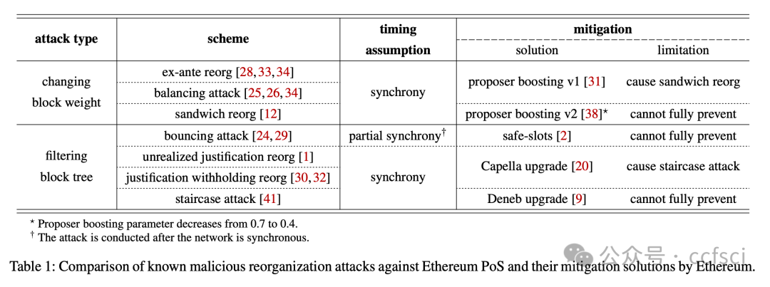 以太坊于 2022 年 9 月从工作量证明 (PoW) 共识过渡到权益证明 (PoS) 共识。此次升级虽然带来了显著的改进(例如,更低的能源成本和更高的吞吐量),但也带来了新的漏洞。一个显著的例子就是所谓的恶意重组攻击。恶意重组是指拜占庭式故障验证者故意操纵规范链,导致诚实验证者生成的区块被丢弃的攻击。通过这样做,故障验证者可以获得诸如更高的奖励、更低的链质量,甚至对系统构成活性威胁等好处。