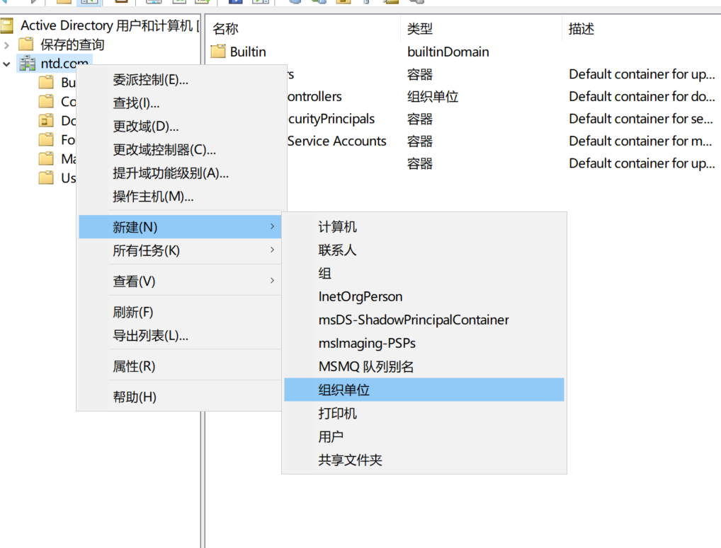 组织单位 是 Active Directory 中的一个容器,用于在一个域内 分组和管理用户、计算机、组等其他AD对象。