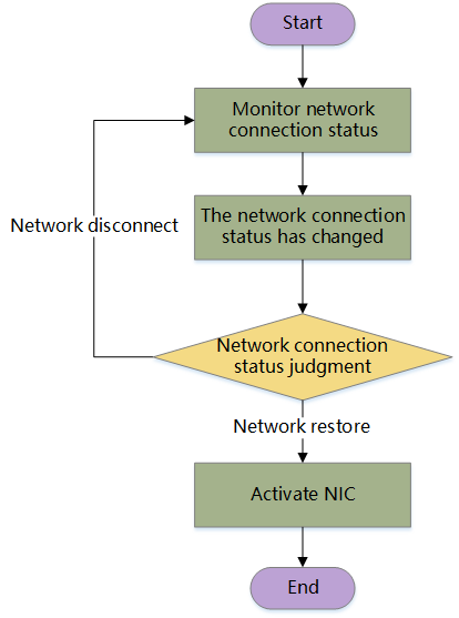 系统会监控设备与无线网络的连接状态,当网络连接断开了,引起网络异常的因素消失后,设备会自动发起附着流程(Attach procedure)重新注册到网络上。一旦注册成功,系统会按照之前的网卡配置参数重新激活网卡。