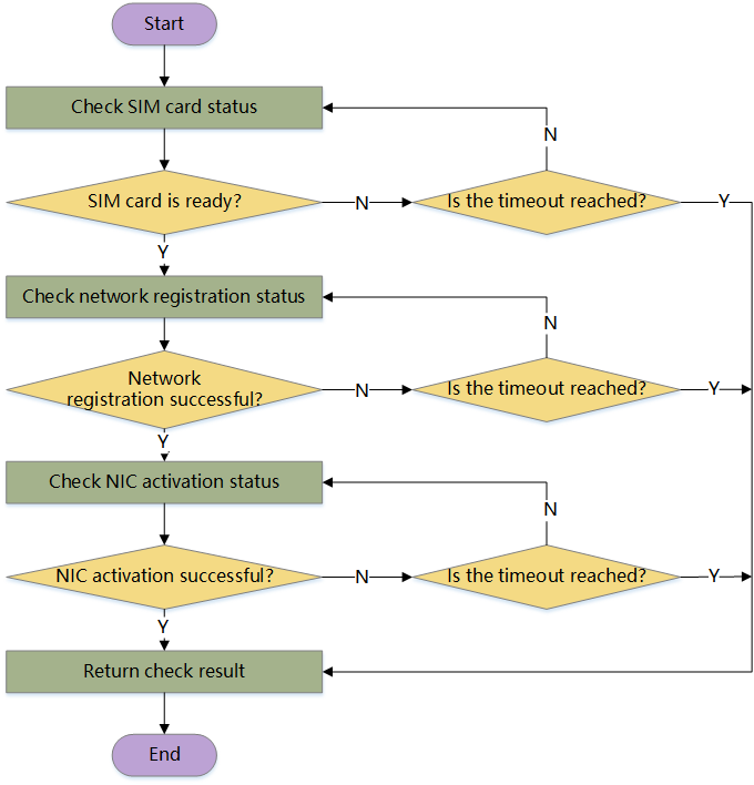 该方法会完整的检测SIM卡状态、设备网络注册状态以及蜂窝无线网卡激活状态。并且还可以设置超时时间,即在该超时时间内,如果检测到蜂窝无线网卡以及激活成功,则会立即返回,否则该方法会一直阻塞到超时才会退出。